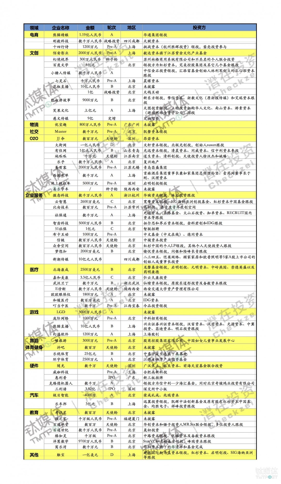 控制本周本钱流向,看潜正在投资家。本周潜正在收录投融资事务有136起,周比增加高达50%,此中国内64起,国外72起。✔️。 次要分布正在文创、O2O和企业办事3大范畴,此中文创范畴本周呈迸发式增加趋向,9起投融事务中……✔️。 处正在第二梯队的是医疗和教育范畴,此中教育范畴近期本钱增加较着,上周6起均为较小额融资,本周7起,单笔融资金额大幅上涨……✔️。 种子轮11起;A轮30起,占比约有47%;本周B轮阶段的融资增加较着,有12起;3起C轮融资仍然均为过亿元大额融资;本周……✔️。 红杉本钱本周投资很是活跃,别离投资了百度文学、众舍空间(小我LP)、云聪慧、乐车邦、触宝,不只如斯,正在国外还取Accel一路参投了G2 Crowd。SIG海纳亚洲……