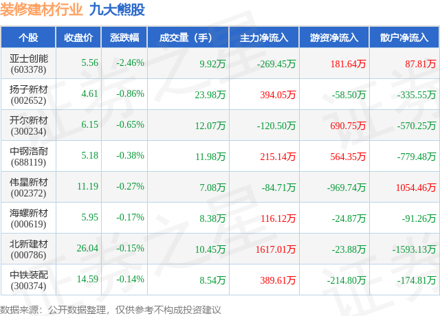 证券之星动静,4月1日,沪指报收3948。55,较前一买卖日上涨1。46%。拆建筑材行业全体表示较弱,较前一买卖日上涨1。03%,23只个股上涨,9只个股下跌。个股表示方面,拆建筑材行业当日领跌股为亚士创能(603378),下跌2。46%,成交量9。92万,从力资金净流出269。45万元。扬子新材(002652)以下跌0。86%紧随其后,该股当日成交量23。98万,从力资金净流入394。05万元。除此之外,开尔新材(300234)、中钢洛耐(688119)、伟星新材(002372)均进入当日熊股之列。具体个股列表见下表: